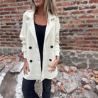 Ta kurtka damska została wykonana z dzianiny, która miękko układa się na sylwetce. Materiał jest przyjemny w dotyku i zapewnia komfort noszenia. Kołnierz nadaje całości wyraźną linię przy szyi. Zapięcie na guziki zwiększa funkcjonalność fasonu. Krój dopasowuje się naturalnie, bez uczucia sztywności.