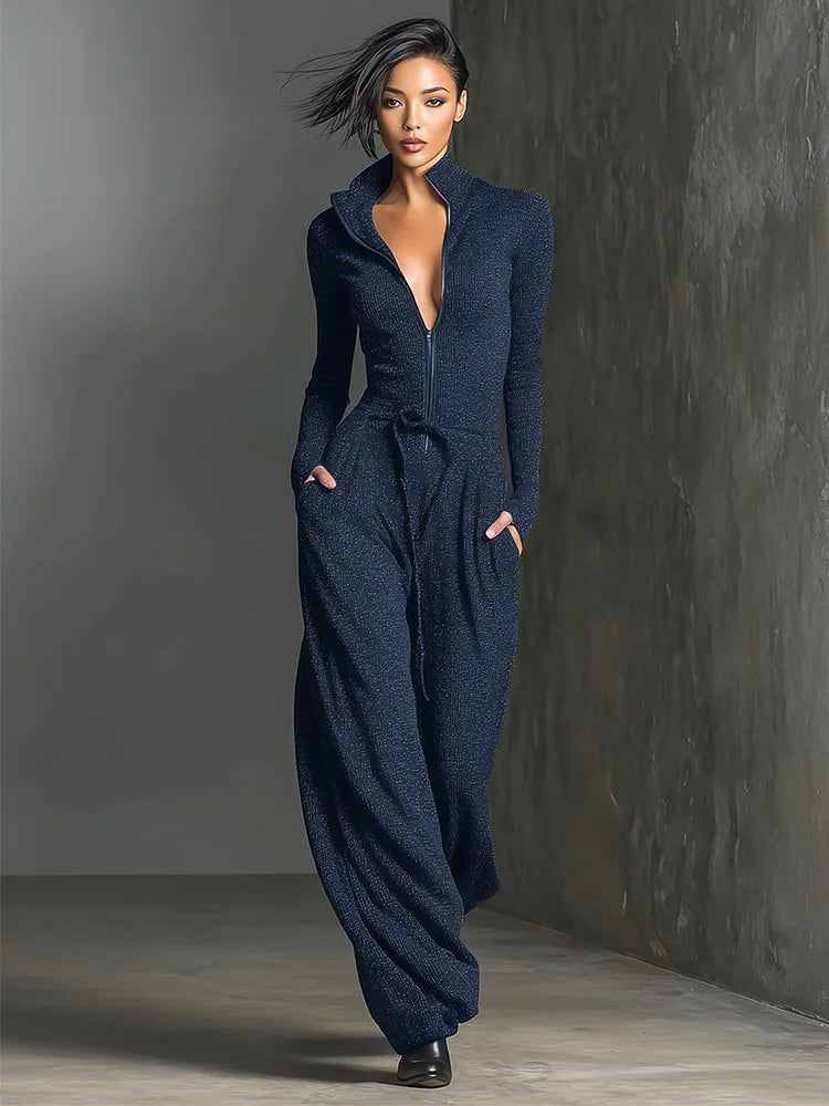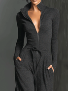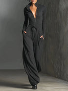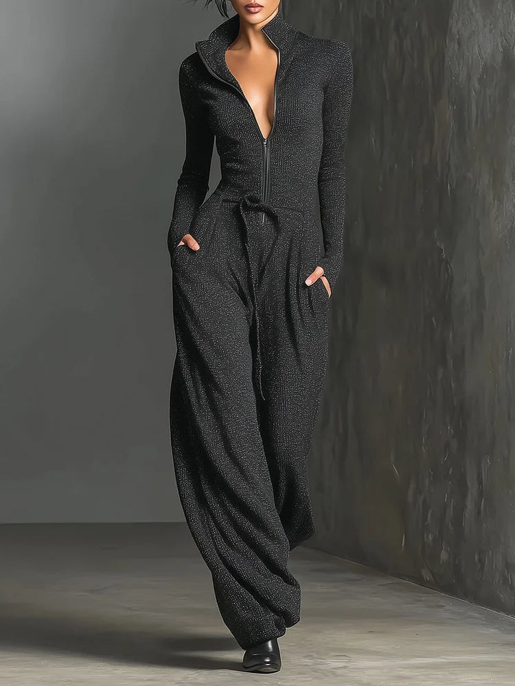 Stylowy, ciemnoszary kombinezon z nutą blasku, z zapięciem z przodu i luźnym, szerokim krojem. Wykonany z elastycznego, zwiewnego materiału dla szykownego i komfortowego wyglądu.
