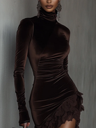 Mini sukienka aksamitna Chiara łączy dopasowaną, kobiecą sylwetkę z delikatnymi koronkowymi detalami, tworząc romantyczny i wyrafinowany wygląd. Wysoka szyja i długie rękawy równoważą krótki krój, tworząc nowoczesną elegancję idealną na kolacje, przyjęcia i wieczorne wydarzenia.