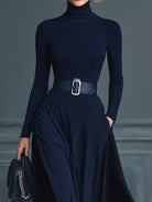 Ciemnoniebieska dzianinowa sukienka z wysokim kołnierzem