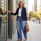 Te szerokie jeansy damskie z wysokim stanem łączą klasyczną formę z nowoczesnym krojem. Trwały denim dobrze układa się na sylwetce i zapewnia wygodę w codziennym użytkowaniu. Wysoki stan podkreśla talię i nadaje proporcjom harmonii. Szerokie nogawki tworzą płynną linię i gwarantują swobodę ruchów. Kieszenie z tyłu dodają praktyczności oraz dopracowanego wykończenia.