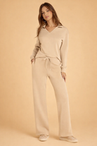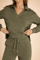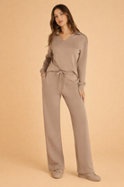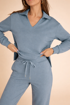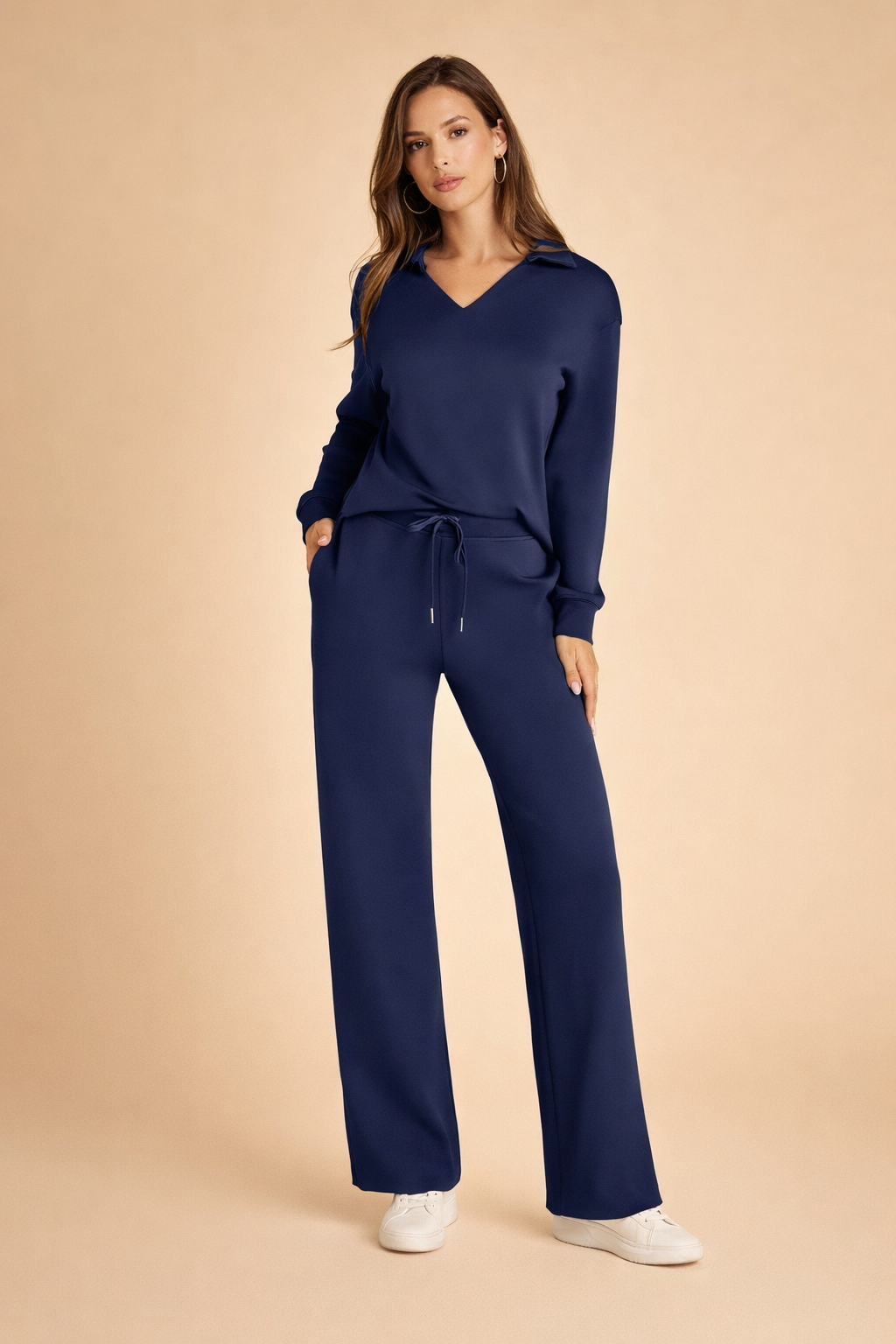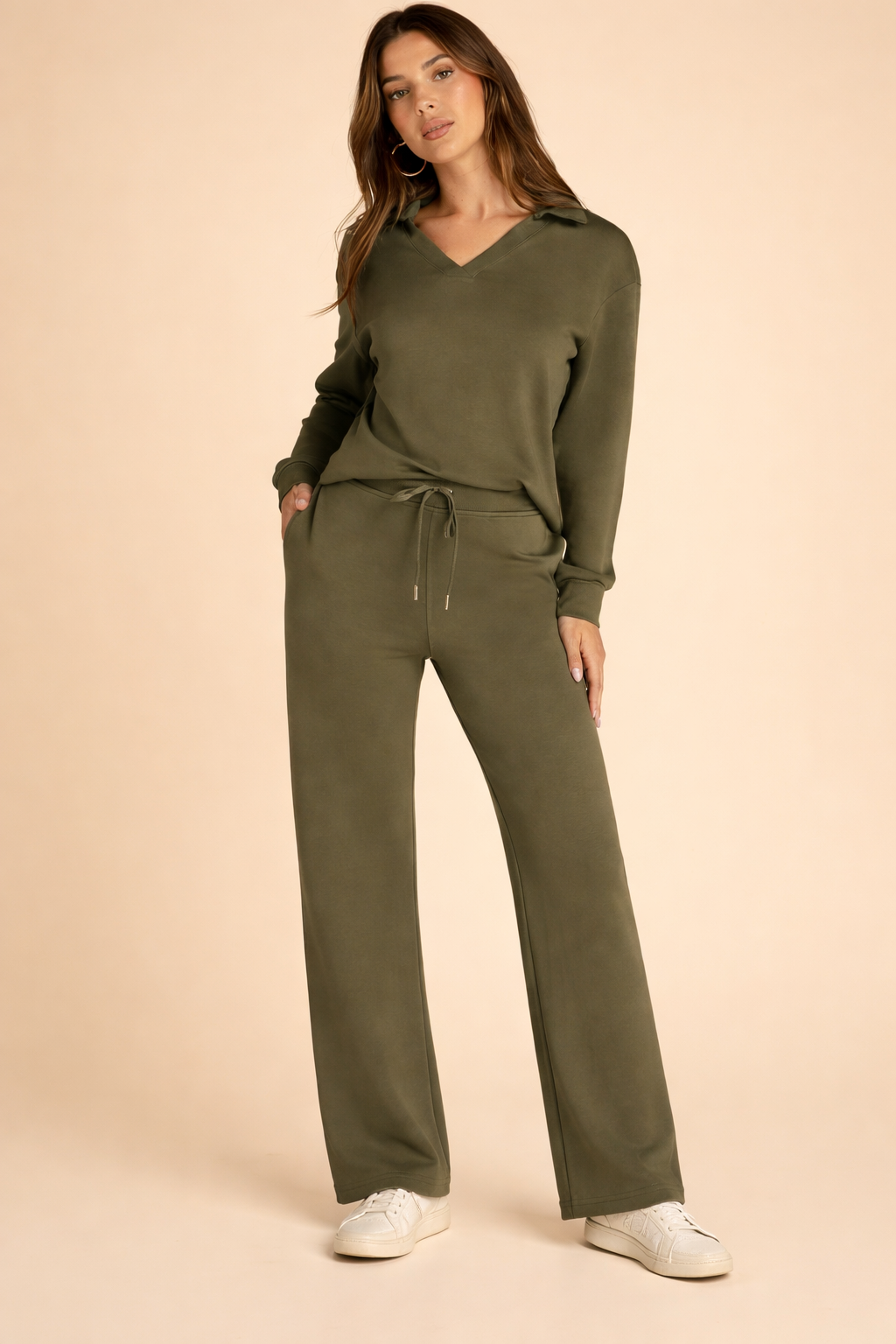Ten damski komplet został zaprojektowany jako spójny zestaw do swobodnego użytkowania na co dzień. Bluza o luźnym kroju miękko układa się na sylwetce i nie ogranicza ruchów. Szerokie spodnie zapewniają naturalną swobodę i płynność podczas chodzenia. Materiał jest przyjemny w dotyku i komfortowy przy dłuższym noszeniu. Całość tworzy uporządkowany, lekki wygląd bez zbędnych detali.